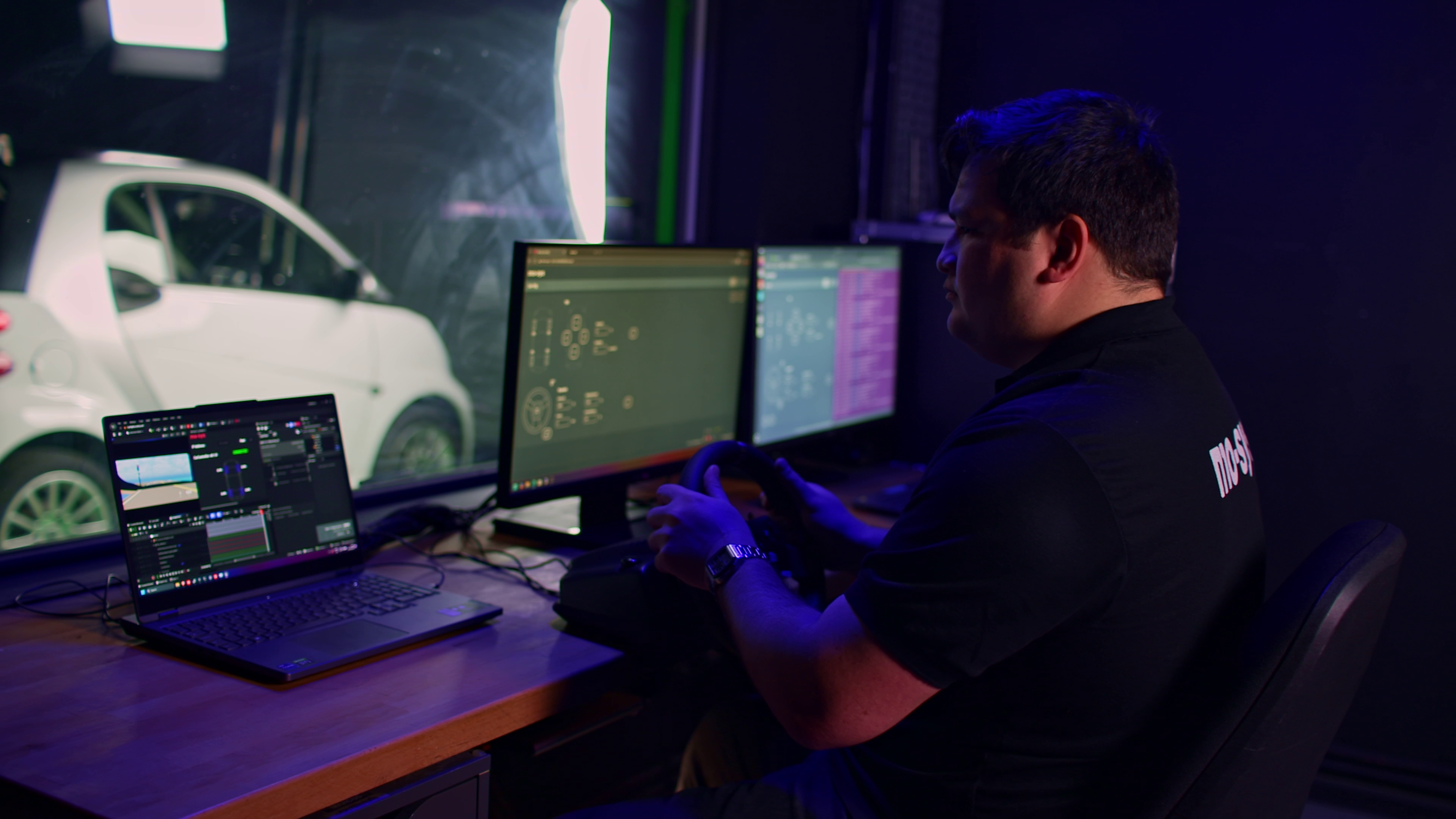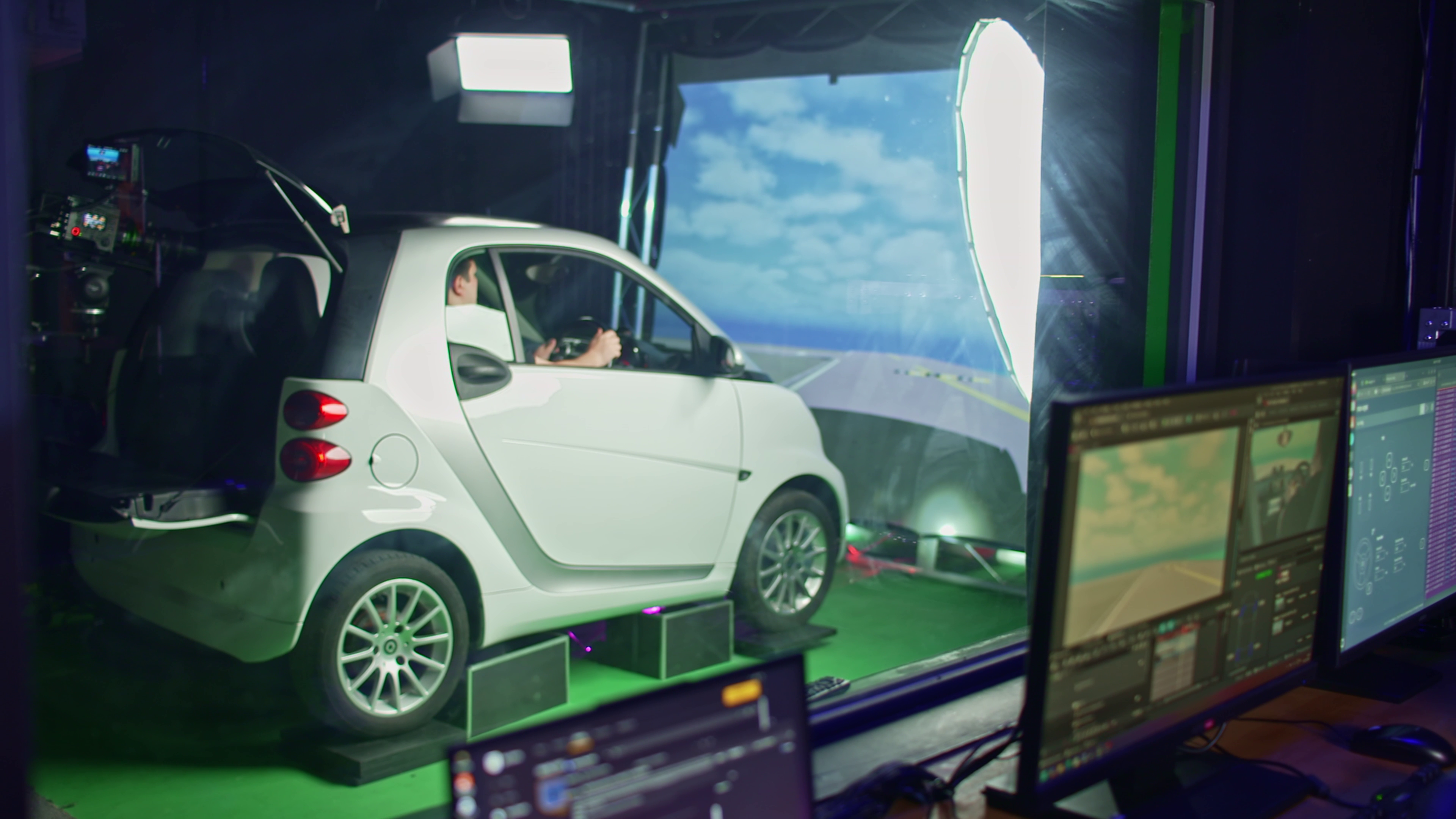 The pre-recorded motion actively drives the steering wheel, allowing actors to focus on performance, with steering actions and environmental motion perfectly matched.