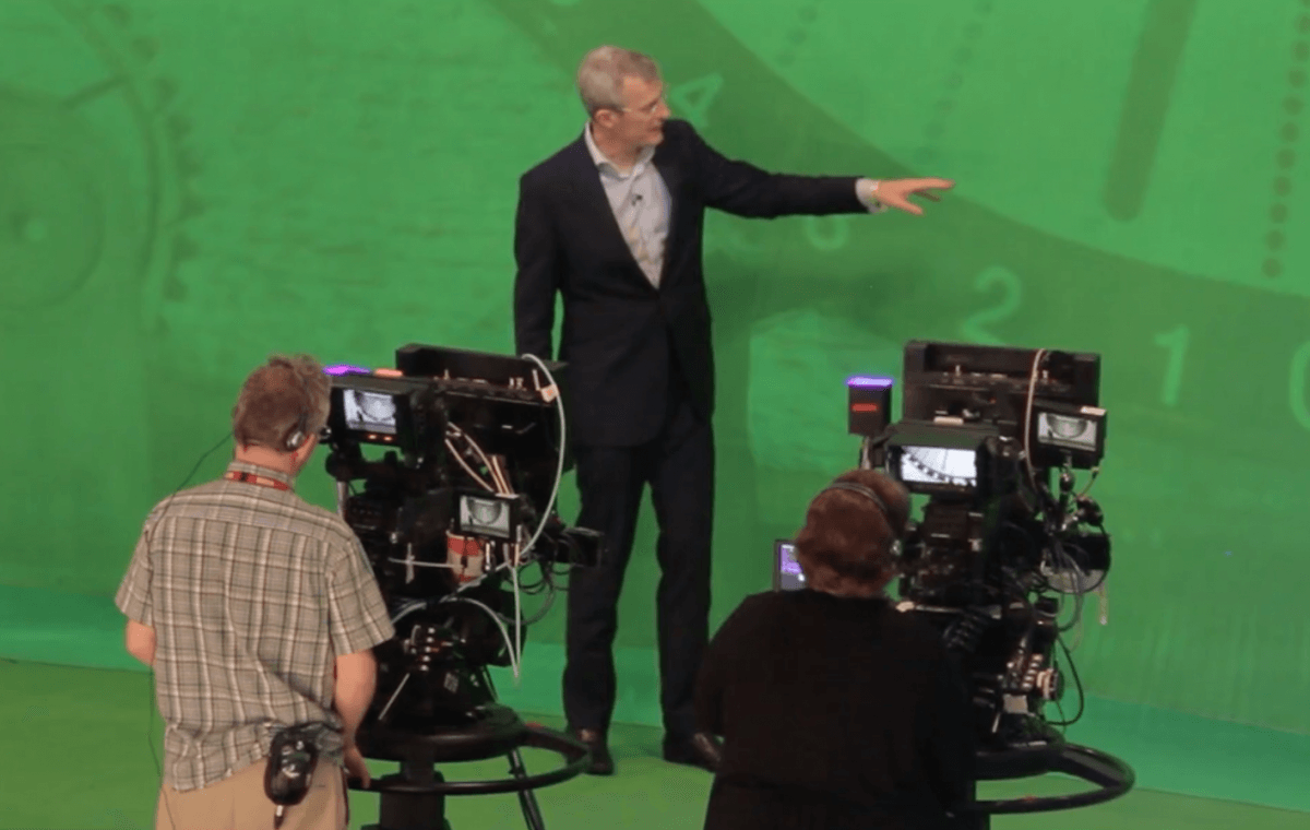 Two StarTracker on pedestals and Jeremy Vine pointing at the virtual Swingometer.